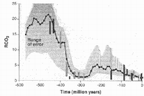 Réponse: La teneur estimée en CO2 de l'atmosphère était de (chiffre) à (chiffre) fois (choisir le mot: plus ou moins) forte que la teneur actuelle. Explications: La teneur de CO2 atmosphérique dépend de la quantité de roches sédimentaires à une époque donnée, et du pH de la mer (qui règle l'équilibre CO2 gaz - CO2 dissout).