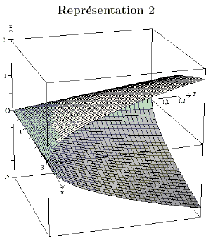 1- Répondre, par VRAI ou FAUX, aux affirmations suivantes en justifiant votre réponse. Affirmation 1: La surface contient l'origine O du repère. Affirmation 2: La surface contient le point A(0,1,2). Affirmation 3: La surface contient la demi-droite [Ox). Affirmation 4: La surface contient la demi-droite [Oy).