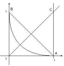 1- (a) Puisque x appartient au segment [0,1], alors . L'équation de est . Cette équation s'écrit: , donc . D'après l'équation ci-dessus, . Puisque x appartient au segment [0,1], alors , donc , donc . On en déduit: , donc . (b) L'équation de ci-dessus ne change pas si on échange les lettres x et y, donc si le point M de coordonnées (x,y) dans le repère orthonormal appartient à , alors le point de coordonnées (y,x), symétrique de M par rapport à la droite d'équation , appartient à .On en déduit que cette droite est axe de symétrie de la courbe . 2- (a) Si était un arc de cercle, alors son centre serait sur la médiatrice du segment [AB] (ci-contre). De plus, puisque , alors l'axe des abscisses est tangent à la courbe au point A, donc le centre du cercle serait sur la perpendiculaire en A à cet axe. On en déduit que le centre du cercle serait à l'intersection des deux droites, donc serait le point C de coordonnées (1,1). Dans ce cas le rayon serait égal à 1. |